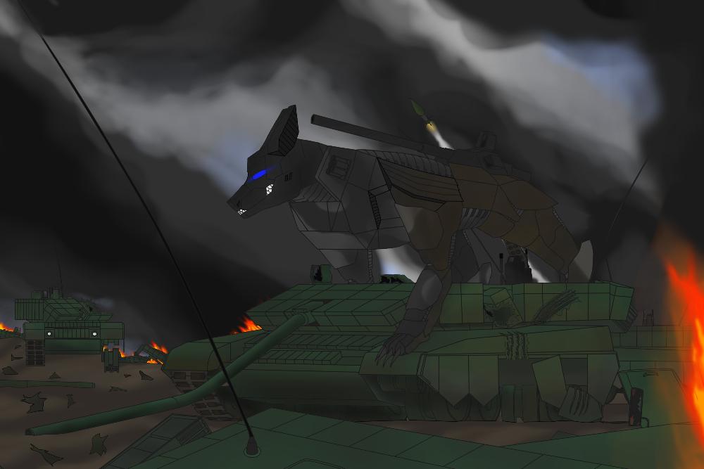 Волк, прыгая из стороны в сторону и уворачиваясь от противотанковых ракет, ворвался в ряды противника, тут же наотмашь ударив когтями по броне бронетранспортера. Длинный плоский хвост стегнул по танку, словно ножом срезав ему орудие. Гена раскрыл пасть и на землю высыпали сразу дюжина механических волчат, которые мгновенно окружили один из танков.